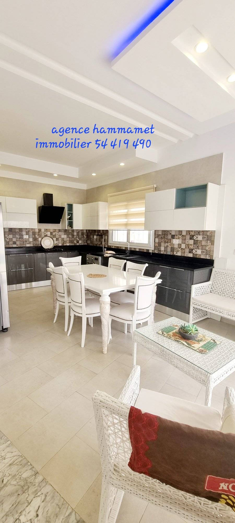 A vendre chez l’agence “ Family immobilier el faidh” , une merveilleuse villa S+4 située dans un quartier chic, calme et bien sécurisé à Hammamet Nord. pas loin d'hôtel Sultan et palm beach .